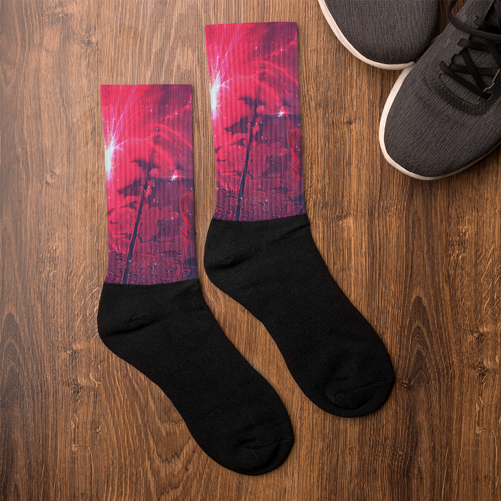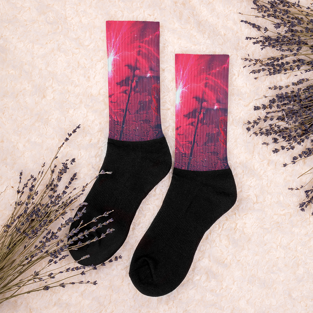 These socks are extra comfortable thanks to their cushioned bottom. The foot is black with artwork printed along the leg with crisp, bold colors that won't fade.